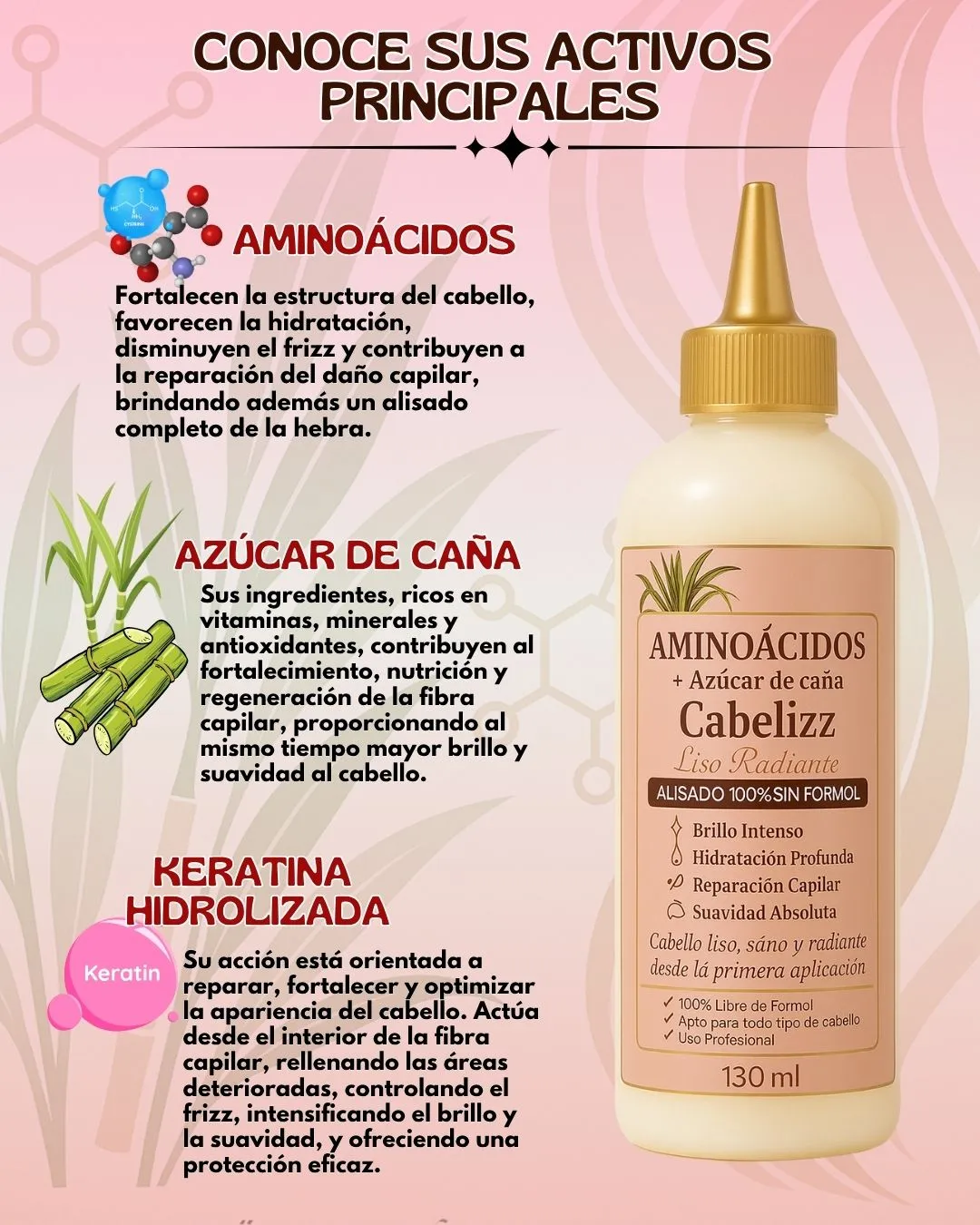 Cabelizz™ es a base de aminoácidos + Caña de azúcar que aportan a tu cabello un liso del 100% desde la primera aplicación, brillo, hidratación y suavidad sin dañar tu hebra capilar. Lucirás un cabello sano y radiante.
